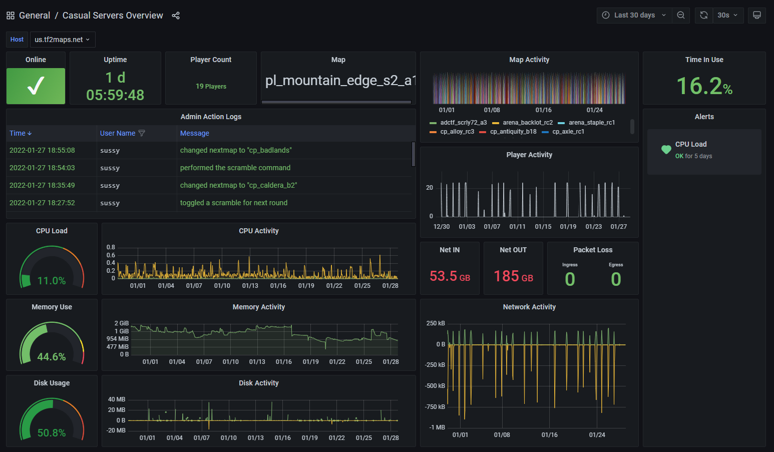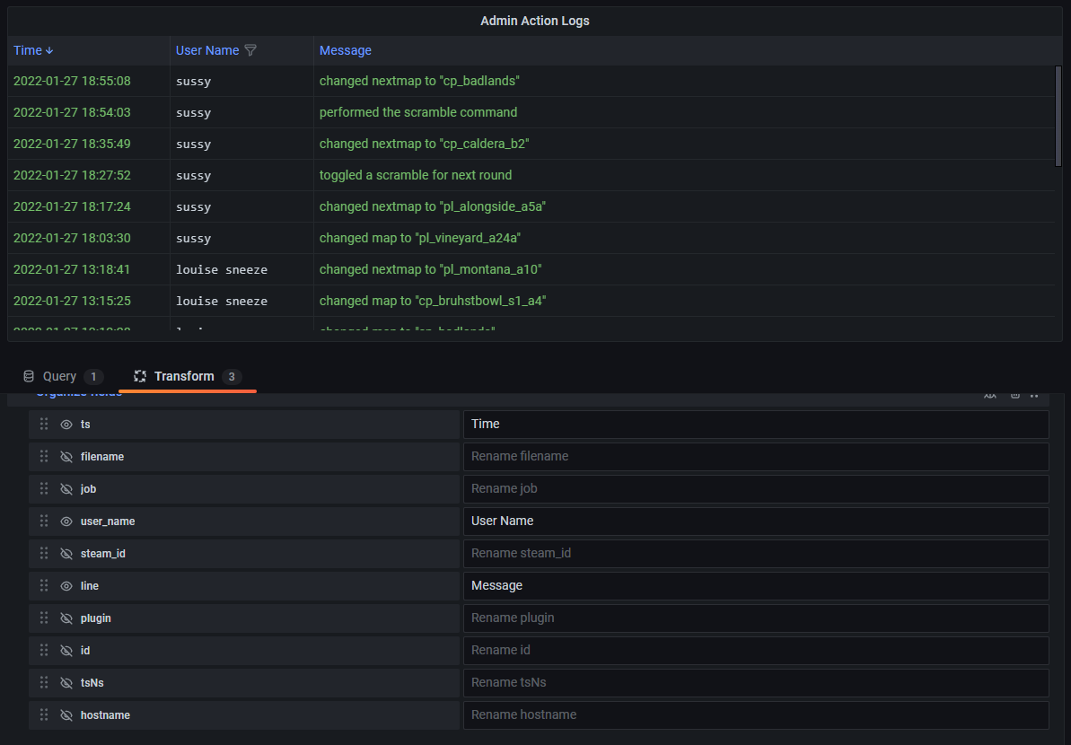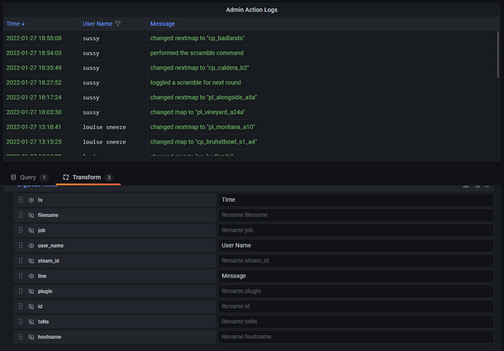 TF2 servers often run modding platforms that come with an ecosystem of plugins for doing administrative actions. One very popular platform is called SourceMod. Many of the built-in plugins will log important information like administrator actions to a log file that I can parse. Obviously logs are not like metrics that can be measured every minute, log files get new lines at random intervals, so it requires a different tool.