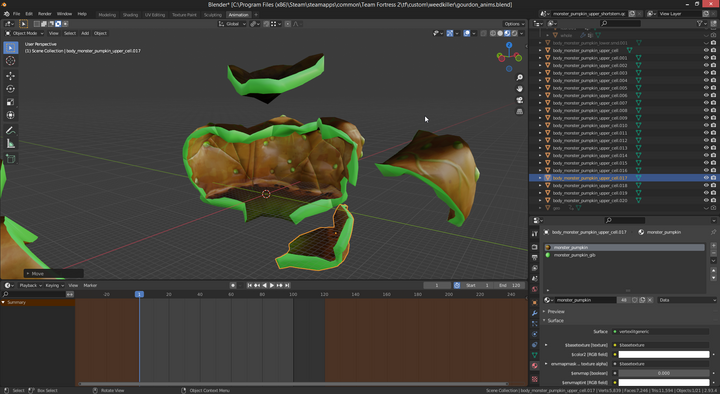This is the full "death" effect I did for the pumpkin monster (named "Gourdon")